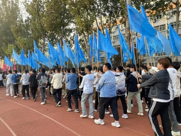 看!迎着秋日习习凉风,彩旗队方阵也在为运动会的到来接续奋进着,彩旗队的男同学们正高举彩旗、阔步昂扬,铿锵有力的整齐步伐烘托着即将迎来运动会的喜悦。