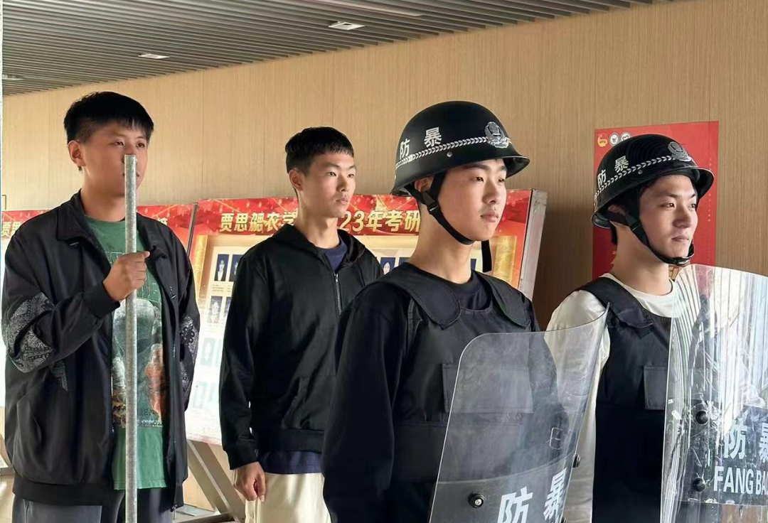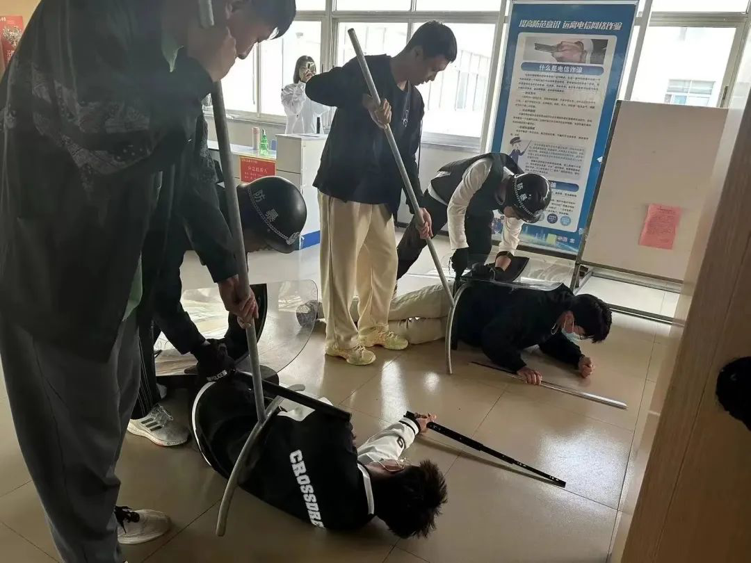 两名“可疑”人员闯入学院,意图对学院值班人员实施暴恐袭击,同学们立即按照预案快速反应,手持盾牌、防暴叉等防暴工具上前与“歹徒”进行对抗搏斗,最终合力将“歹徒”制服。