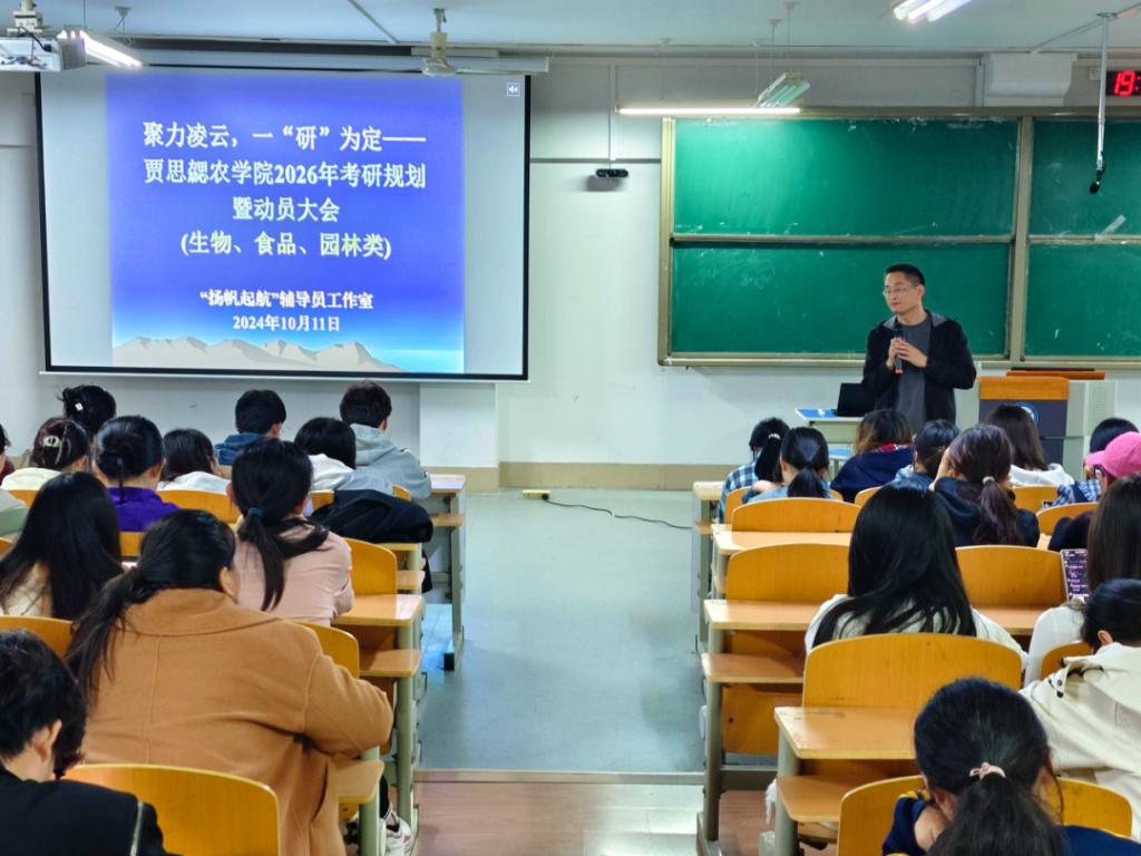 为激发2026届学生的考研热情,帮助考研学子明确备考方向,清晰考研流程,10月11日晚yl7703永利集团在319教室召开“聚力凌云,一“研”为定”——2026届毕业生考研规划暨动员会。农学院考研指导教师李建永做考研规划和备考经验分享,农学院2026届毕业班辅导员及考研意向学生400余人参加。