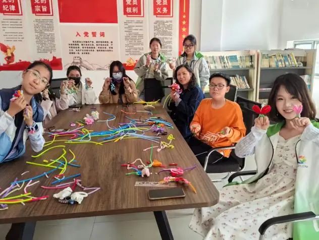 活动伊始,志愿者提前布置好五颜六色的扭扭棒,随后志愿者通过趣味小问答激发小朋友们对事物的好奇心,紧接着便开始了制作环节,志愿者先示范基础技巧,将扭扭棒弯折、缠绕,简单几步就变出了一株小草,小朋友们看到后便迫不及待拿起材料,开始创作自己的植物世界。制作过程中,有的小朋友专注地将绿色扭扭棒弯成螺旋状,制作出充满动感的藤蔓,有的用多根彩色扭扭棒编织出彩虹般的花朵。其中有个小朋友的向日葵花瓣总散开,志愿者便引导他观察真向日葵花瓣的排列,又教他用细线固定,最后在志愿者的帮助下,他成功完成了作品。活动接近尾声,志愿者带领小朋友积极分享自己的劳动成果,孩子们捧着形态各异的扭扭棒植物作品,兴奋地介绍自己的作品,讲述创作灵感,有的说自己做的是会跳舞的向日葵,有的说临近母亲节要把作品送给妈妈,表达对她的爱。