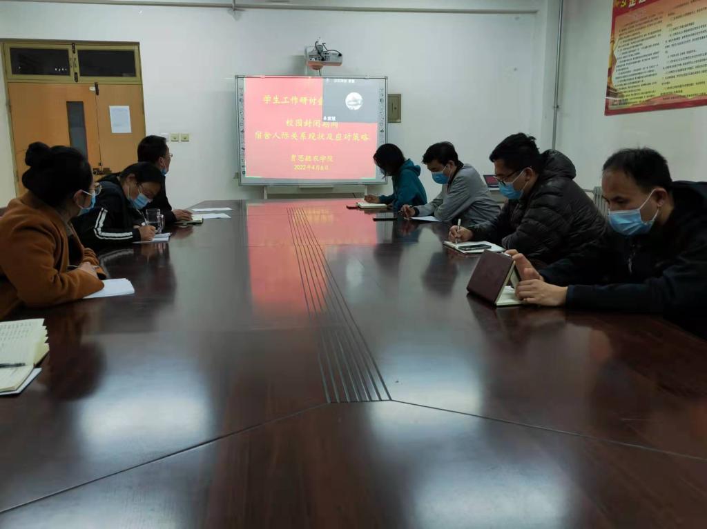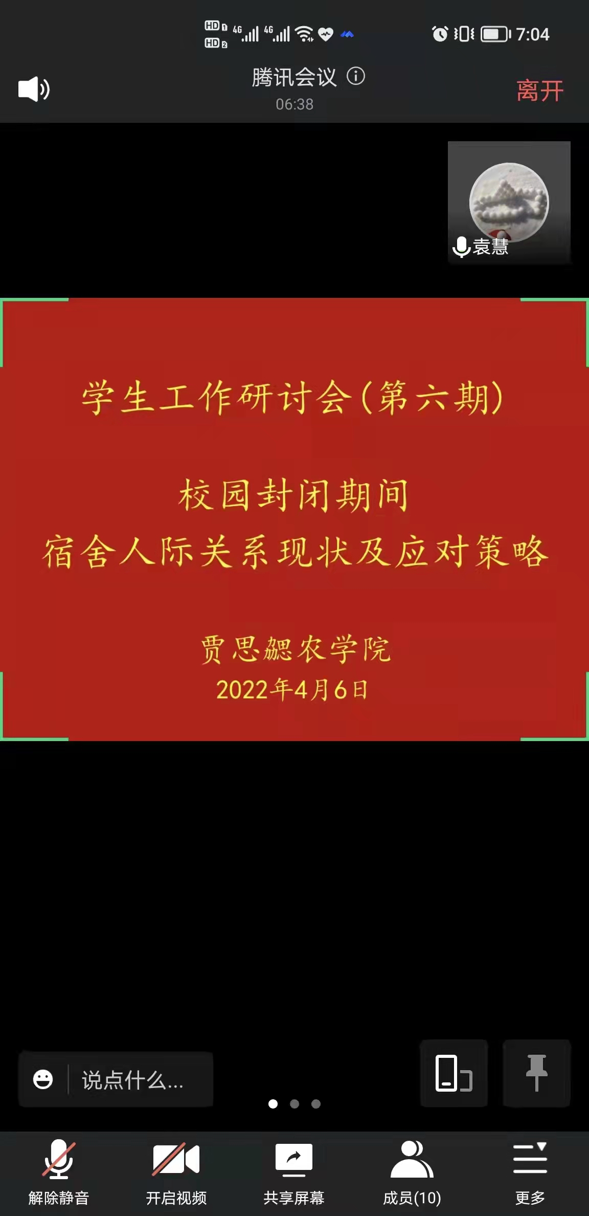 为进一步加强辅导员队伍建设,提高辅导员个人业务能力和职业素养,4月6日晚,yl7703永利集团在308会议室开展校园封闭期间宿舍人际关系现状及应对策略专题线上研讨,会议特邀山东商业职业技术学院团委副书记,第三届山东高校辅导员职业能力大赛一等奖获得者袁慧书记交流经验。农学院党支部书记刘杰主持会议,农学院全体辅导员参加本次研讨会。