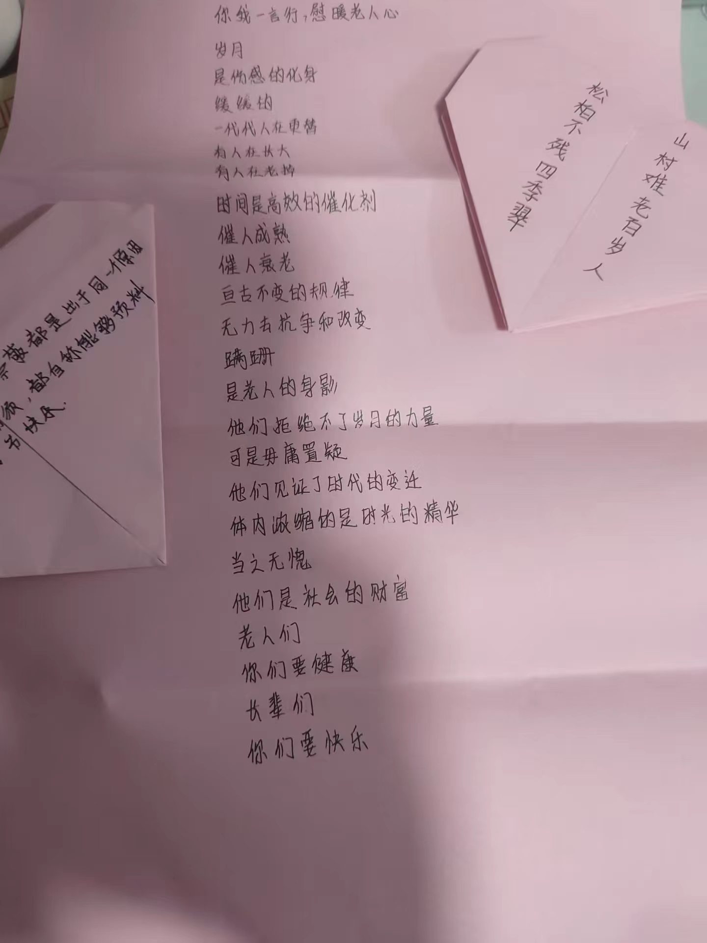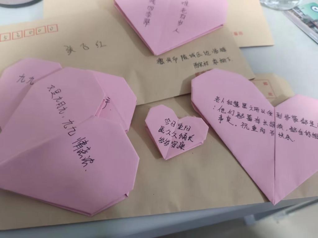 活动中,同学们在彩色卡纸上写下对老人真挚暖心的祝福将其折叠为心形,并将其装在信封中送给老人。为老人们送去了情意满满的节日祝福!一张小小的贺卡承载着同学们的一片真情,让重阳节倍加温暖!活动结束后,志愿者们一致表示,在今后的学习与生活中,将会把中华民族的传统美德传承发扬,让爱的旋律伴随老人,让和谐幸福之花绽放到每一个角落。